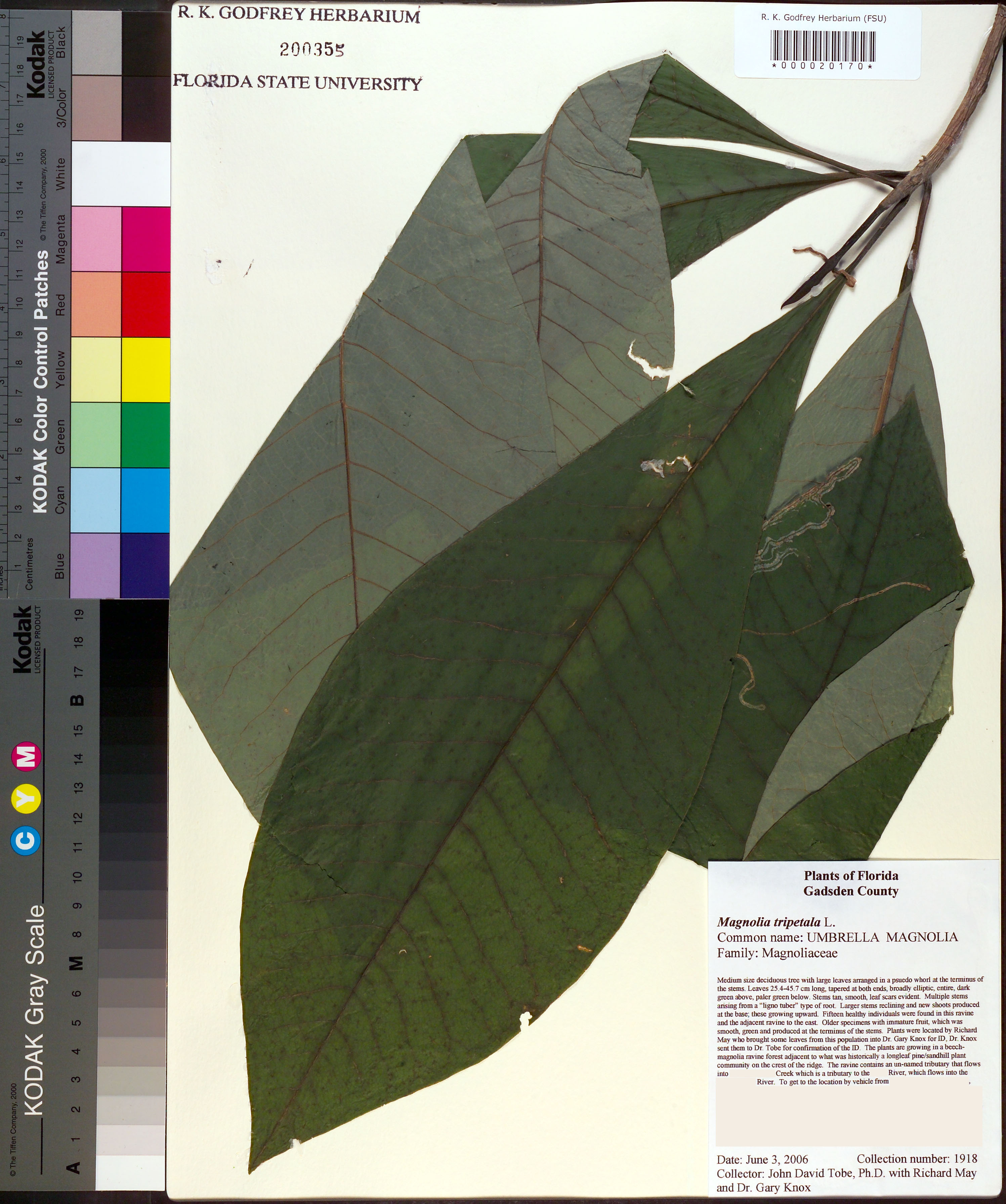| Plant Morphology Observations: | Medium size deciduous tree with large leaves arranged in a psuedo whorl at the terminus of the stems. Leaves 25.4-45.7 cm long, tapered at both ends, broadly elliptic, entire, dark green above, paler green below. Stems tan, smooth, leaf scars evident. Multiple stems arising from a "ligno tuber" type of root. Larger stems reclining and new shoots produced at the base; these growing upward. Older specimens with immature fruit, which was smooth, green and produced at the terminus of the stems. |