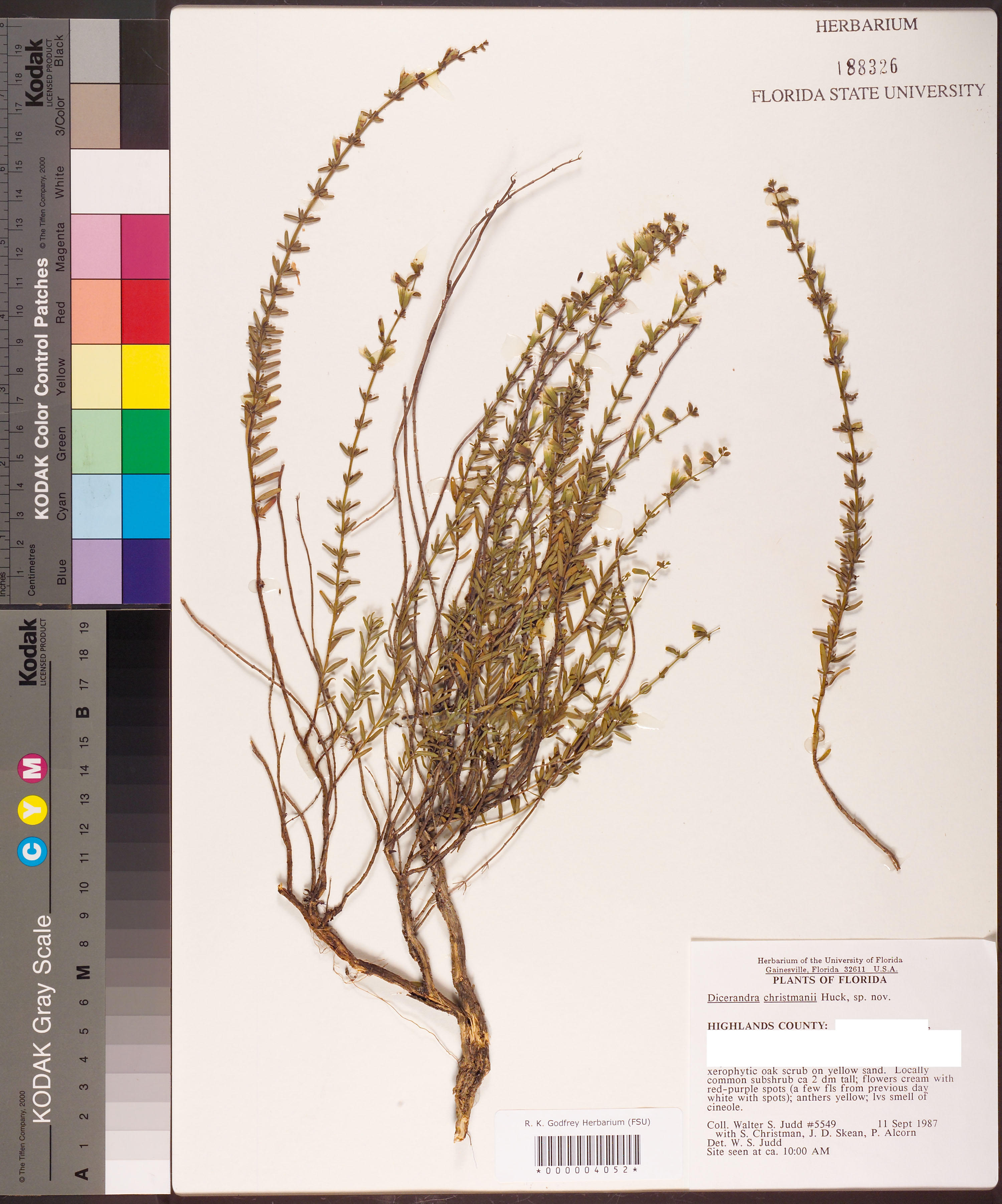 | Plant Morphology Observations: | Locally common subshrub ca 2 dm tall; flowers cream with red-purple spots (a few fls from previous day white with spots); anthers yellow; lvs smell of cineole. |