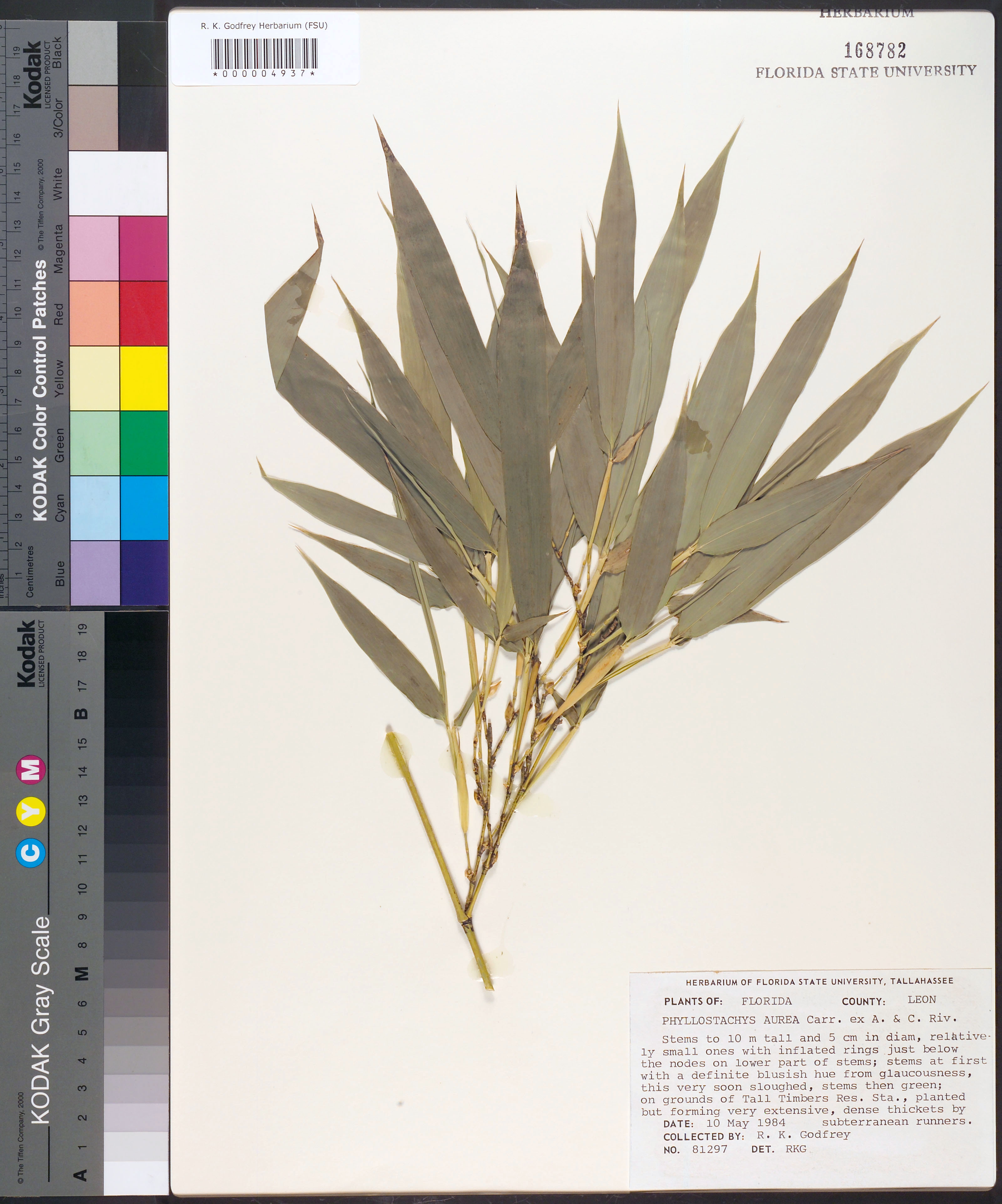 | Plant Morphology Observations: | stems to 10 m tall and 5 cm in diam., relatively small ones with inflated rings just below the nodes on lower part of stems; stems at first with a definite [blueish] hue from glaucousness, this very soon sloughed, stems then green; forming very extensive, dense thickets by subterranean runners. |