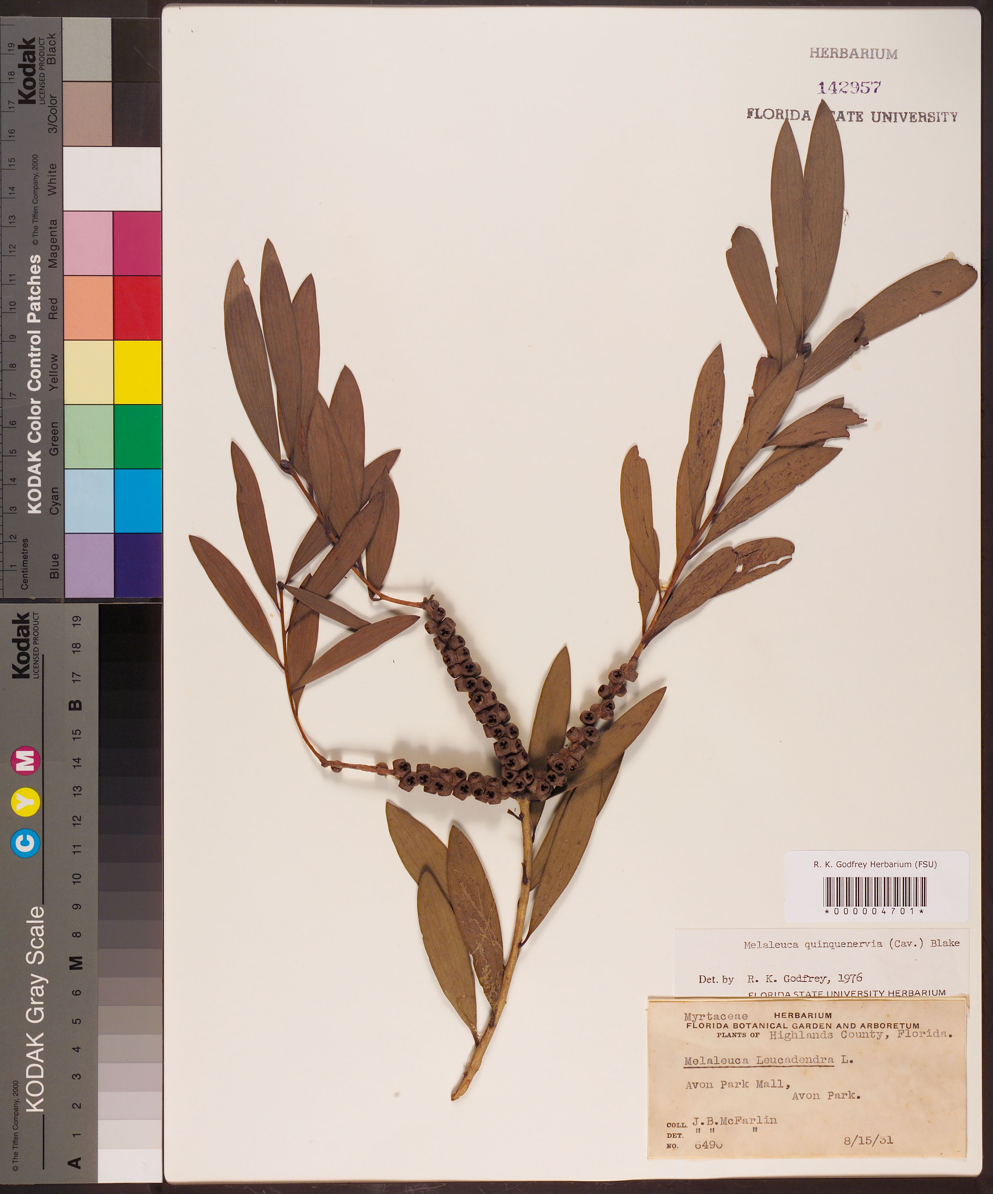 Melaleuca leucandendra L.; det. J.B. McFarlin; coll. 15 Aug 1931; Melaleuca quinquenervia (Cav.) Blake; det. R.K. Godfrey; 1976.