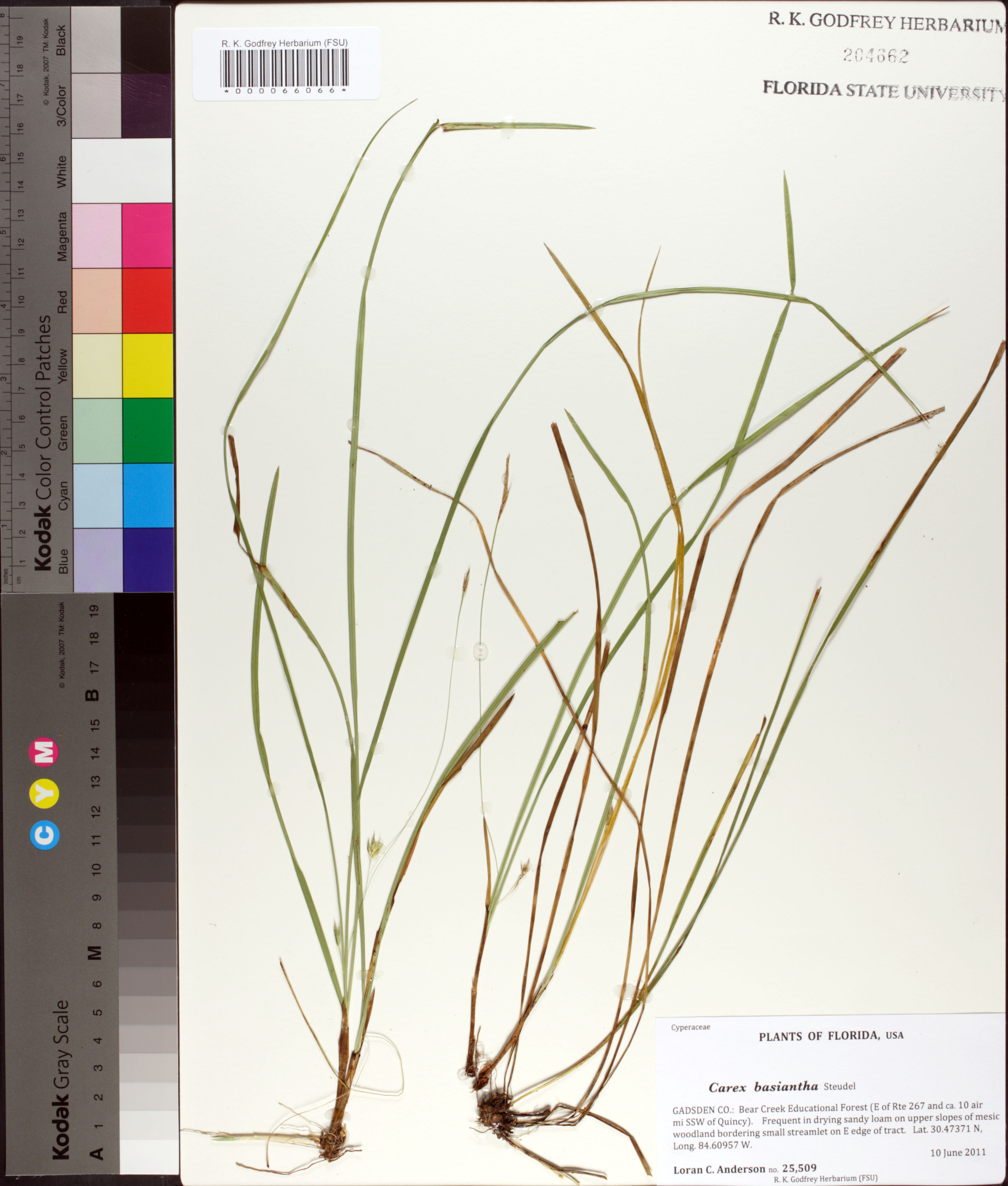 | Habitat: | In drying sandy loam on upper slopes of mesic woodland bordering small streamlet on E edge of tract. |