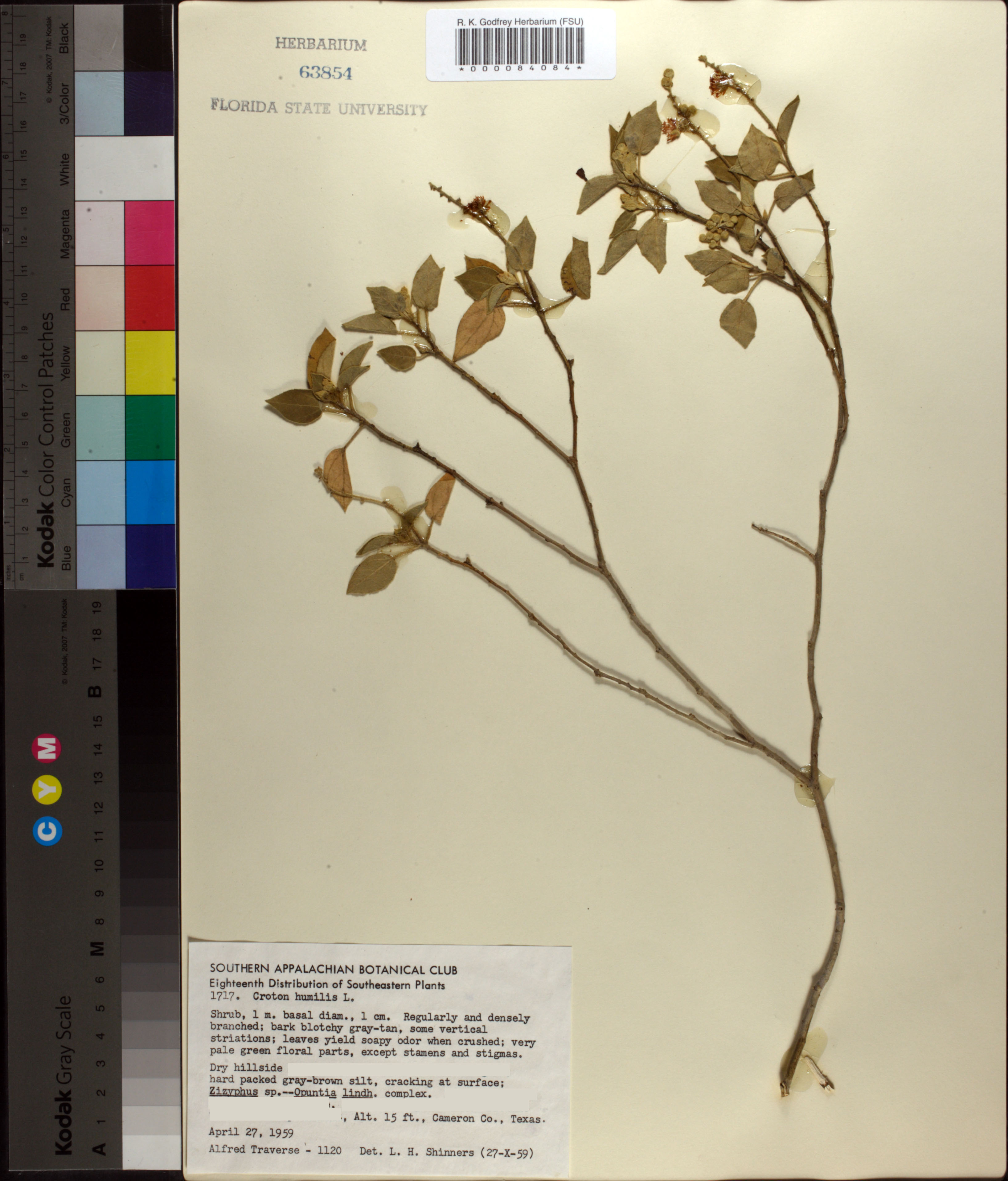 | Plant Morphology Observations: | Shrub, 1 m. basal diam., 1 cm. Regularly densly branched; bark blotchy gray-tan, some vertical striations; leaves yield soapy odor when crushed; very pale green floral parts, except for stamens and stigmas. |