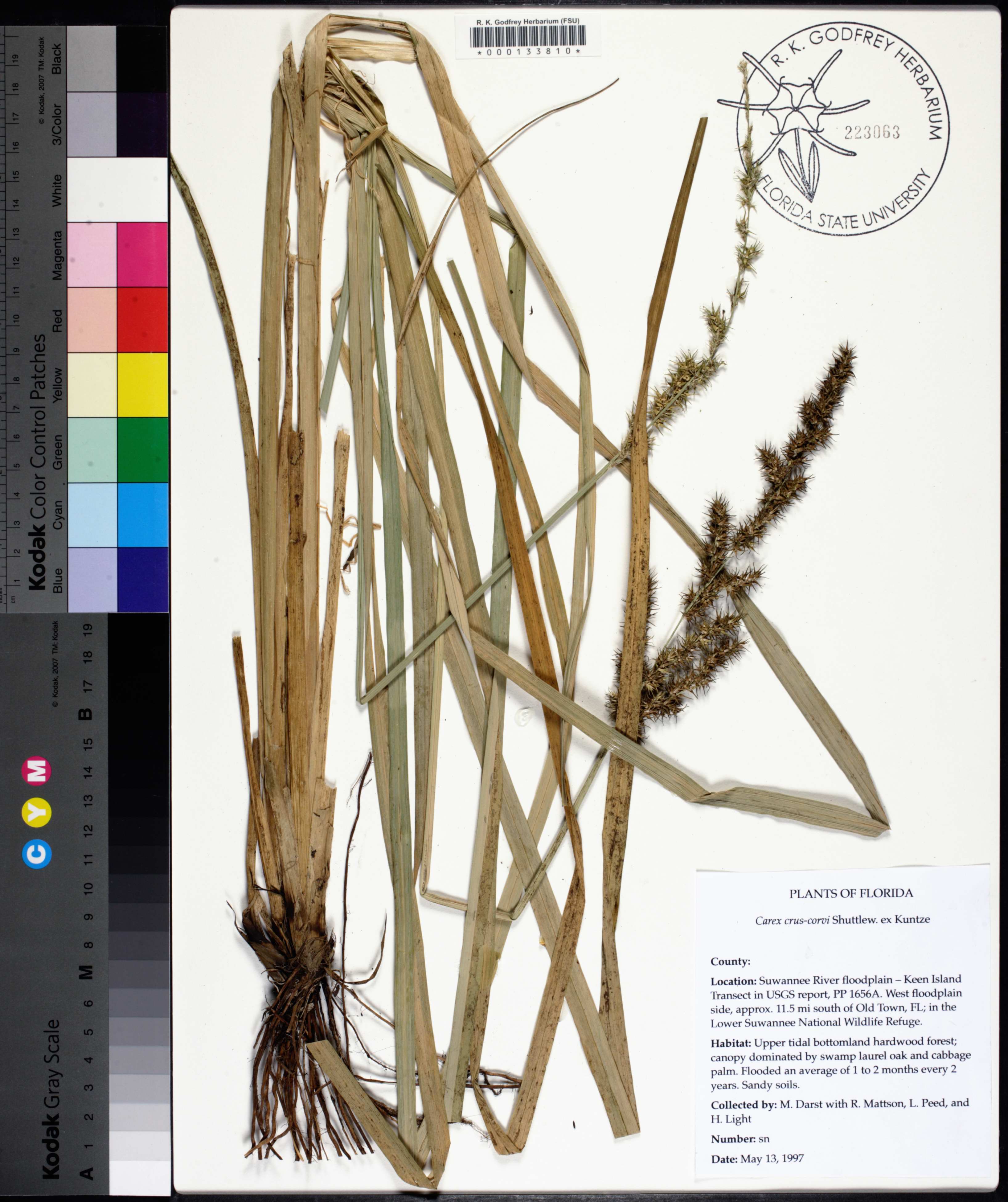 | Verbatim Directions to Locality: | Suwannee River floodplain--Keen Island Transect in USGS report, PP 1656A; west floodplain side, approx. 11.5 mi south of Old Town, FL; in the Lower Suwannee National Wildlife Refuge |