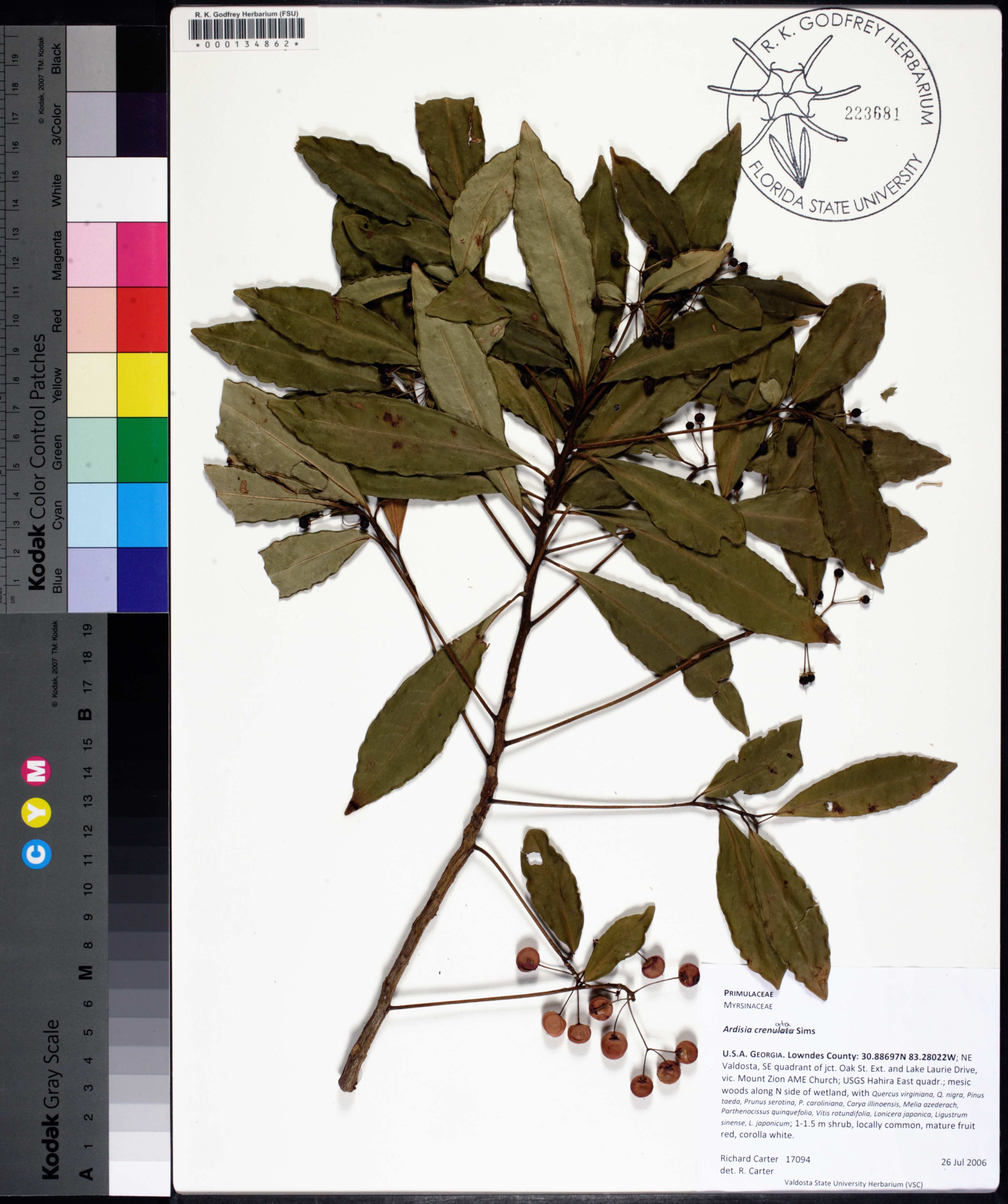 | Habitat: | mesic woods along N side of wetland, with Quercus virginiana, Q. nigra, Pinus taeda, Prunus serotina, P. caroliniana, Carya illinoensis, Melia azederach, Parthenocissus quinquefolia, Vitis rotundifolia, Lonicera japonica, Ligustrum sinense, L. japonicum |