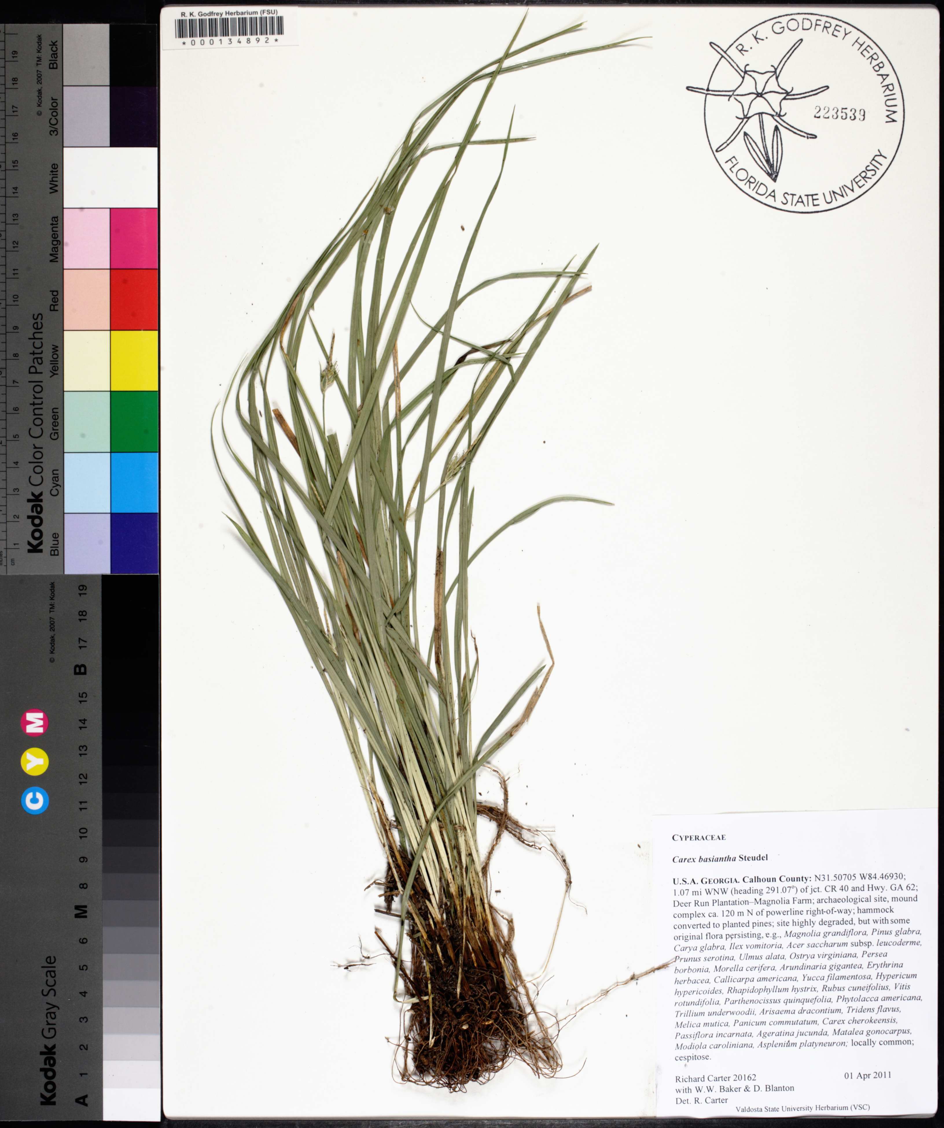 | Habitat: | hammock converted to planted pines; site highly degraded, but with some original flora persisting, e.g., Magnolia grandiflora, Pinus glabra, Carya glabra, Ilex vomitoria, Acer saccharum subsp. leucoderme, Prunus serotina, Ulmus alata, Ostrya virginiana, Persea borbonia, Morella cerifera, Arundinaria gigantea, Erythrina herbacea, Callicarpa americana, Yucca filamentosa, Hypericum hypericoides, Rhapidophyllum hystrix, Rubus cuneifolius, Vitis rotundifolia, Parthenocissus quinquefolia, Phytolacca americana, Trillium underwoodii, Arisaema dracontium, Tridens flavus, Melica mutica, Panicum commutatum, Carex cherokeensis, Passiflora incarnata, Ageratina jucunda, Matalea gonocarpus, Modiola caroliniana, Asplenium platyneuron |