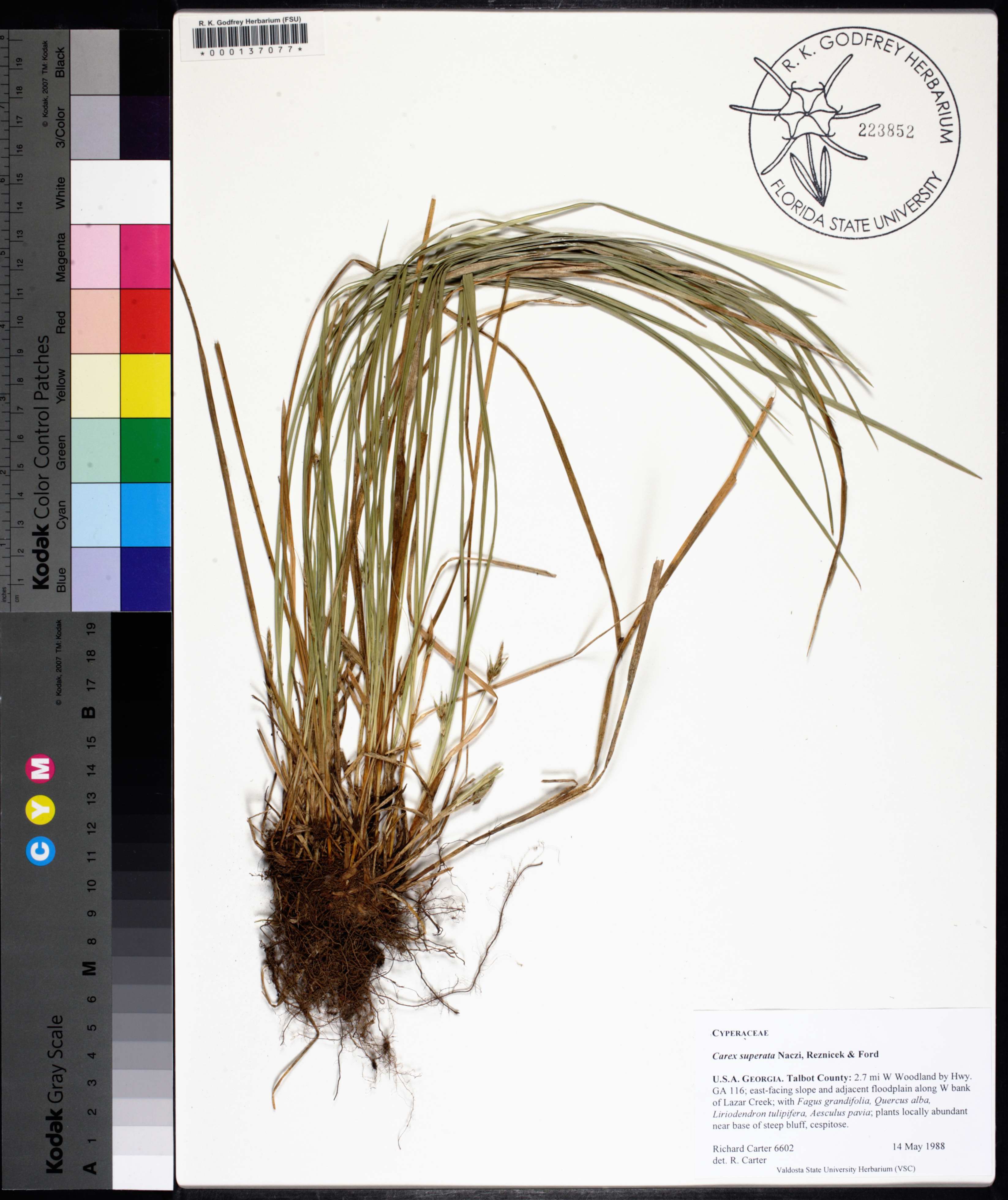 | Habitat: | east-facing slope and adjacent floodplain along W bank of creek; with Fagus grandifolia, Quercus alba, Liriodendron tulipifera, Aesculus pavia; near base of steep bluff |