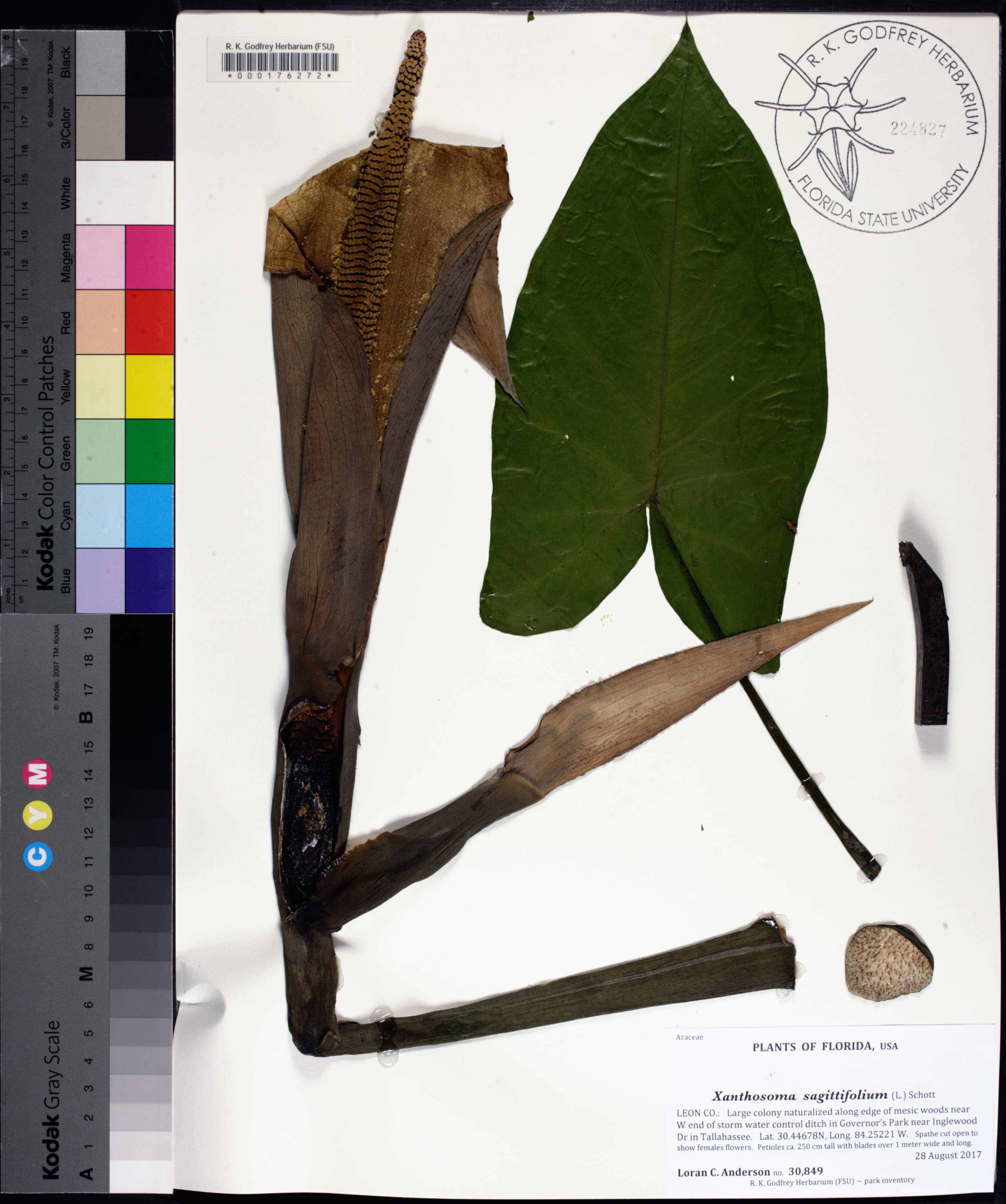 | Plant Morphology Observations: | Spathe cut open to show females flowers. Petioles ca. 250 cm tall with blades over 1 meter wide and long. |